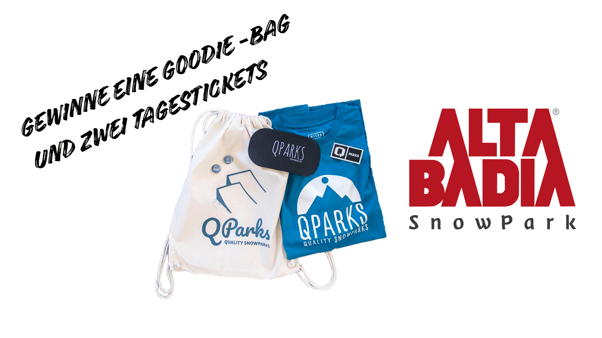 Das obergeile QParks Goodiebag besteht aus einem Gymbag, einer QParks Soggle, zum Schutz deiner Goggle, einem QParks T-Shirt, Stickern und Buttons. Obendrauf gibt’s noch zwei Tageskarten für das italienische Skigebiet Alta Badia in den Dolomiten. Das Skigebiet verfügt über 53 bequeme und schnelle Skilifte und 130 Kilometer bestens präparierte Skipisten inklusive Snowpark!