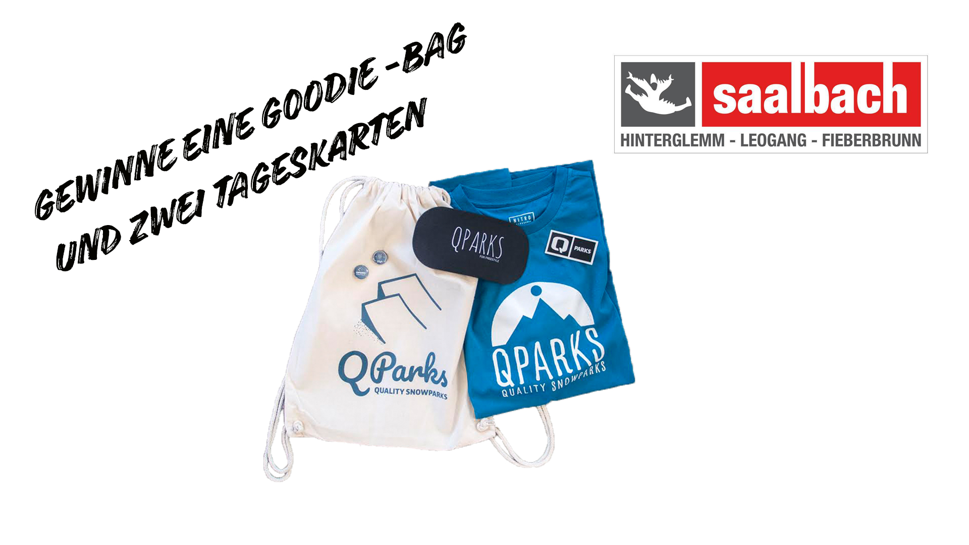 Das obergeile QParks Goodiebag besteht aus einem Gymbag, einer QParks Soggle, zum Schutz deiner Goggle, einem QParks T-Shirt, Stickern und Buttons. Obendrauf gibt’s noch zwei Tageskarten für den Skicircus Saalbach Hinterglemm Leogang Fieberbrunn. Das Skigebiet verfügt über 70 Liftanlagen und 270 Pistenkilometer inklusive Snowpark!