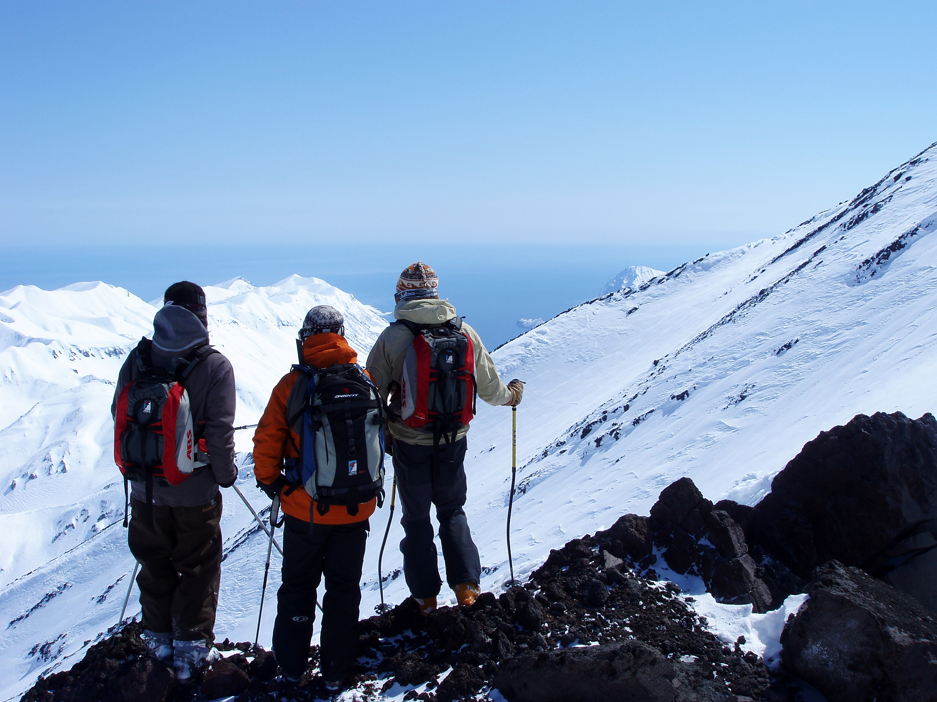 Diese Mischung aus wunderschöner Pazifikküste und den mit Schnee bedeckten Feuerbergen empfängt jeden Skifahrer in Kamtschatka, wo wir in den nächsten Tagen von verschiedenen Vulkanen Richtung Tal fahren werden.