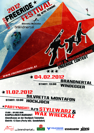 Nach einer gelungenen Premiere des Freeride Festivals im Montafon 2011 haben es sich die beiden Organisatoren Eric Themel und Chisi Speckle zur Aufgabe gemacht das Festival wachsen zu lassen. Im Februar 2012 wird es somit 2 Stops in Sachen Freeride im Ländle geben. Dabei erwarten sie die beiden Organisatoren erneut die Top Fahrer aus der internationalen Freeride Szene. Schon im vergangenen Jahr durfte man den Weltmeistern im steilen Gelände über die Schultern schauen und waghalsige Lines mit Spannung verfolgen.