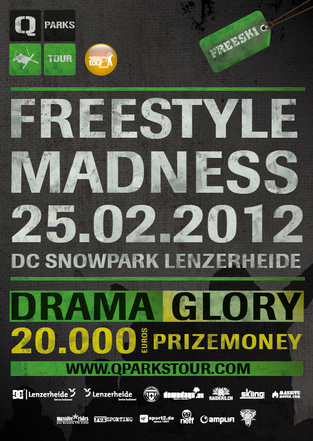 http://mpora.com/videos/72mB16QfY Let’s get mad! Am 25. Februar 2012 ist es endlich wieder soweit und die QParks Freeski Tour macht einen Ausflug in unser schönes Nachbarland in den DC Snowpark Lenzerheide. Auch heuer werden sich Freeskier in den Kategorien Rookies, Ladies und Allgemein im Slopestyle Contest um Ruhm, Ehre und ein Preisgeld von insgesamt € 1.500,- batteln. Spannung ist garantiert, denn die Freestyle Madness ist heuer auch erstmals Teil der Swisscom Freeski Tour.