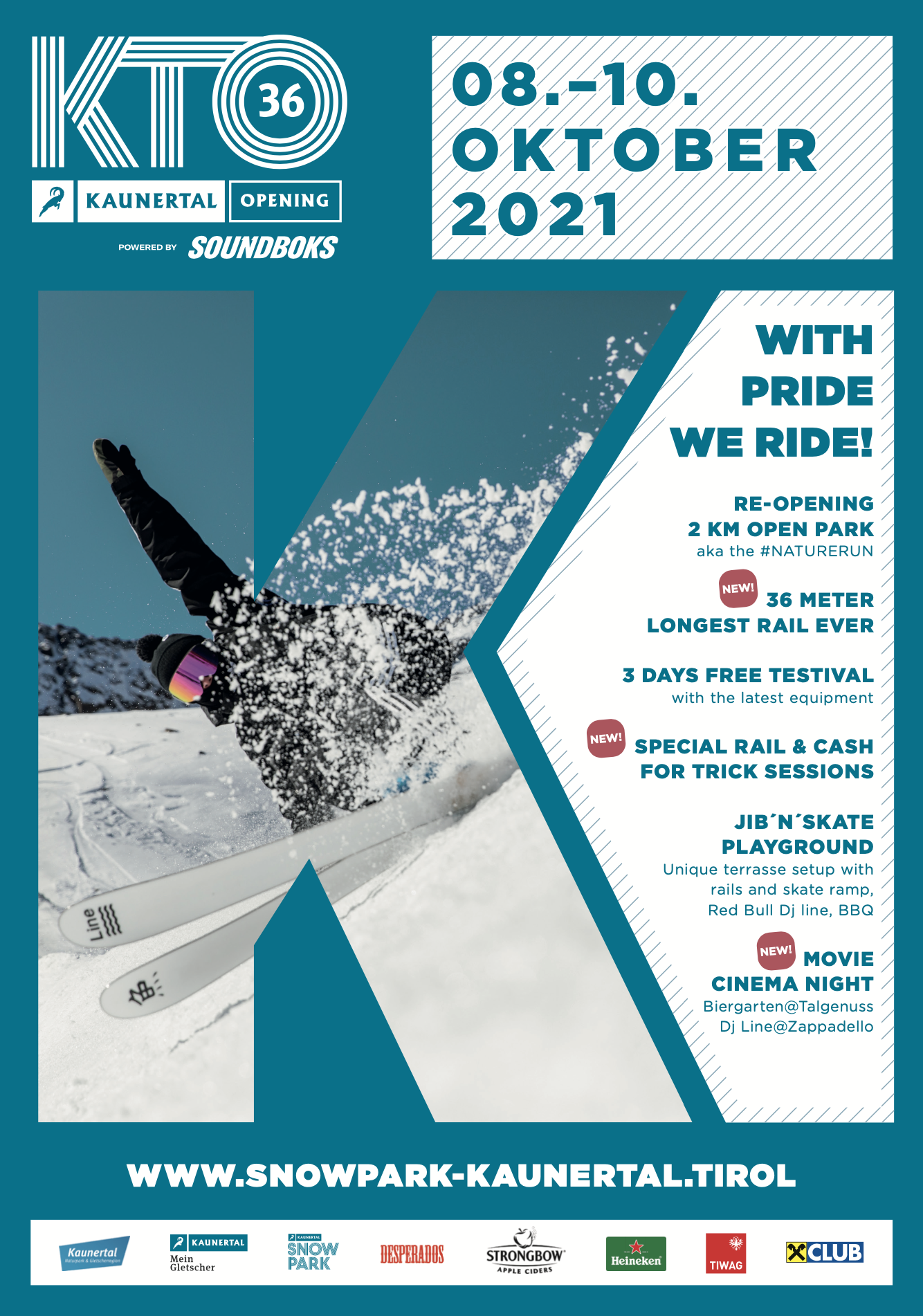 Das Kaunertal Opening aka KTO setzt seine Tradition fort und erfindet sich nach den vergangenen schwierigen Monaten wieder neu. Mit der 36. Ausgabe des Opening-Klassikers werden zahlreichen neue Programmpunkte und Änderungen umgesetzt: neues Shape Team, neue Rails, neue Rail-Farben, neuer Hauptpartner und ein abwechslungsreiches Programm mit einigen Aushängeschildern der Szene als Hosts. Snowpark Kaunertal ist immer eine Reise wert – heuer mehr denn je. So let’s go!
