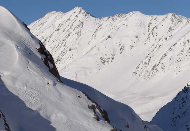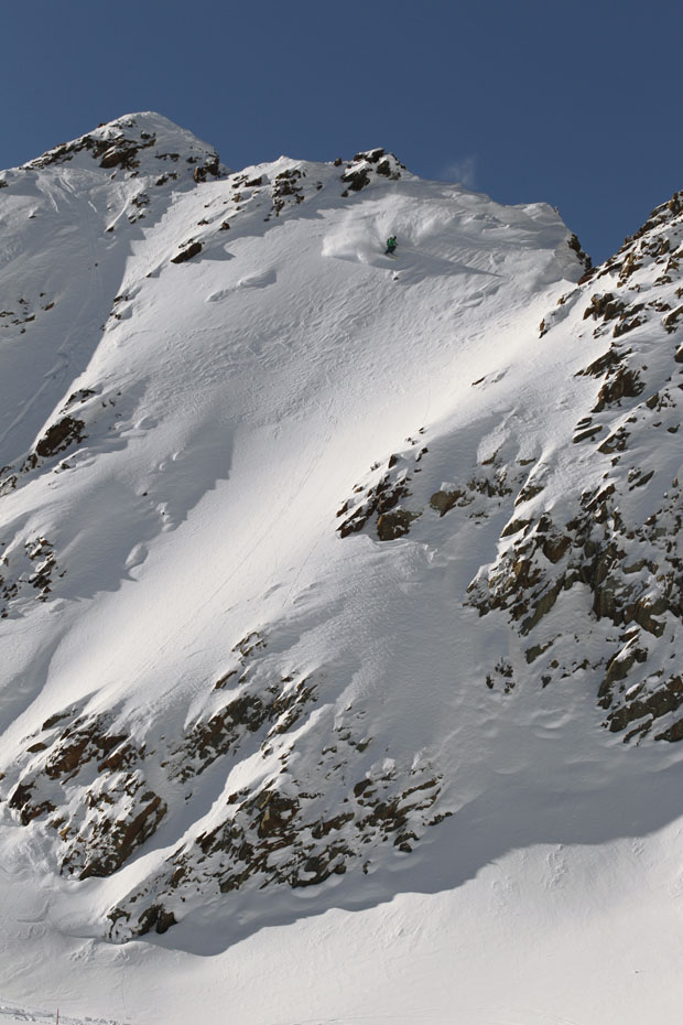 Die ISPO konnten wir endlich hinter uns lassen und mit ihr auch den Blutgehalt im Alkohol – oder anders herum? Egal, geblieben waren uns jedenfalls doch eine knappe Hand voll prominenter Pommesrutscher aus Alaska, Kanada und Frankreich. Die drei 4FRNT Rider, Eric Hjorleifson, Cody Barnhill und Nicolaz Cruz nutzten die durchaus gefallenen Schneemassen der österreichischen Alpen und “tripten” mit unserem Chefredakteur und Hoffotografen, Roman Lachner, ins Pitztal. Geführt vom ortskundigen Marketingchef der Pitztaler Bergbahnen, Stefan Richter, war es kein Kunststück die ein oder andere Melkung sicker Powderlines in Bilder umzuformen.