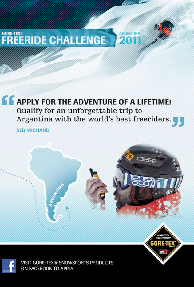 Hierfür lädt Freeride-Veteran Seb Michaud zum ersten Mal überhaupt einen Amateur in seine Profitruppe aus den besten Ridern der Welt ein. Interessierte können sich ab sofort zur „GORE-TEX® Freeride Challenge“ auf www.facebook.com/GORETEX.SnowsportsProducts anmelden. Dort läuft der Wettbewerb den ganzen Winter bis März 2011. Der Weg nach Argentinien führt über insgesamt fünf verschiedene Challenges: