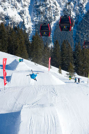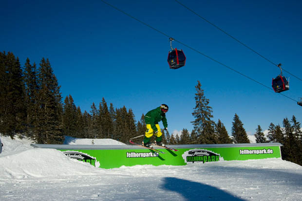 Einfach hatten es die Raupenfahrer der Fellhornbahn und die fünfköpfige Mannschaft des Almdudler Fellhornparks heuer nicht ihr Werk fertigzustellen. Mehrere Male wurde der Park unter einer meterhohen Schneedecke begraben und musste wieder komplett ausgeschaufelt werden. Die Niederschläge haben aber auch ihre gute Seite, denn über Schneemangel können sich die Parkbauer nicht beschweren. Im Gegenteil – anstatt sich zu beschweren hat man aus dem Vollen geschöpft, und so entstand unterhalb der Mittelstation ein Freestyle-Areal das den internationalen Vergleich nicht zu scheuen braucht.