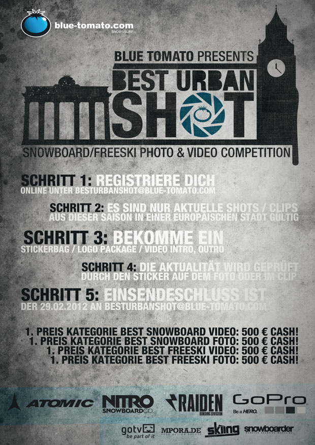 Der internationale Boardsport online Shop Blue Tomato sucht die kreativsten Fotos und Videos von Snowboardern und Freeskiern aus Europa. Beim ‚Best Urban Shot’ Wettbewerb können sich alle Cityshredder an Rails und Obstacles der europäischen Großstädte austoben. Idealerweise prangt ein bekanntes Wahrzeichen der auserwählten Stadt im Foto bzw. dem Video. Alle eingeschickten Kunstwerke werden von einer Fachjury ausgewertet. Insgesamt gibt es 2.000 € in bar zu vergeben.