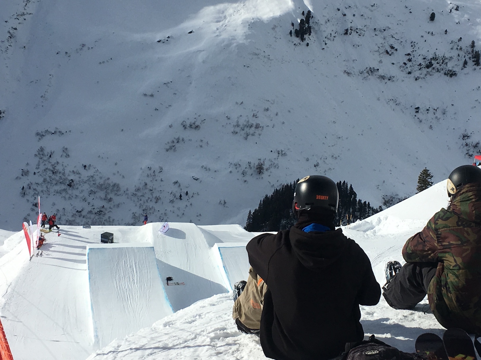 Das Setup bestand aus einer Downrail, 6 meter lang, gefolgt von einer Canon-Rail /Flat-High-Rail auf 2 Kicker, 18 und 15 meter. Am Trainingstag waren beste Bedingungen. Die Rider konnten bei Bluebird und Sonne das Setup shredden.