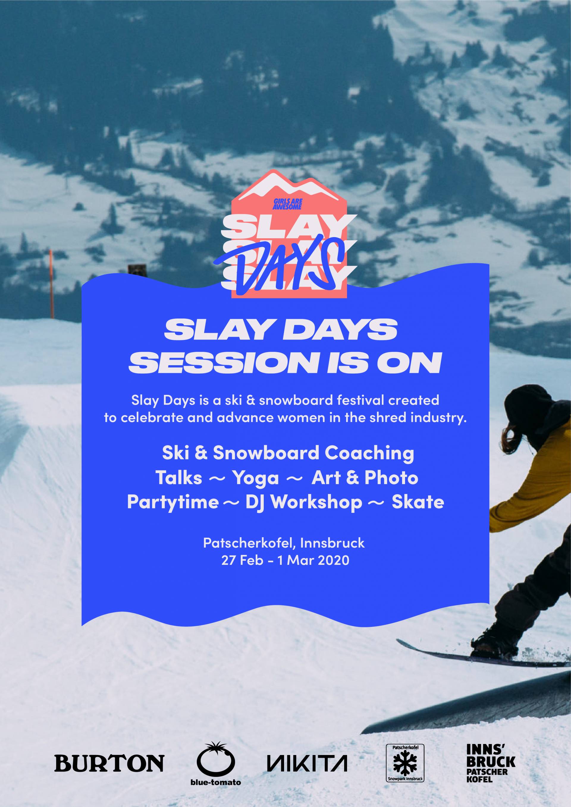 Die Action am Berg ist das Kernelement der Slay Days, doch geht es bei der 4-Tages-Veranstaltung um viel mehr. Im Fokus stehen auch die urbanen kulturellen Elemente, die eng mit den Sportarten, die wir lieben, verknüpft sind. Präsentiert von Girls Are Awesome – einer ‚purpose-driven’ Brand und Medienplattform – sind die Slay Days eine Mischung aus On-Snow Freestyle Coaching Sessions, Talks, Yoga, Kunst, Skateboarding, Musik & Partys. Im Park haben Teilnehmerinnen die Chance, Titel für “Best Style”, “Best Attitude” oder “Best Progression” zu gewinnen. Die Blue Tomato Team Rider Katha Buchegger, Alieke Hoi und Maya Casier werden mit hilfreichen Tipps und Tricks zur Seite stehen, und die Innsbrucker Girl Gang Shred Unit zeichnet für die Nikita G.W.R. Coaching Session verantwortlich. Die Patscherkofel Park-Crew wartet mit einem Park-Setup auf, das allen viel Spaß machen wird. Burton Snowboards bietet an allen Tagen die Möglichkeit, das Step-On System zu testen. Off-Snow präsentiert Girls Are Awesome drei Vorträge und Gesprächsrunden und hat für einen Abend Women in Boardsports (WIB) mit an Bord geholt. Alba Pardo (WIB und SBES Magazine) ist Gastgeberin einer illustren Talk-Runde mit Valeria Kechichian und Lauren MacCullum. Valeria ist die Gründerin der @longboardgirlscrew und eine erfahrene TEDx Rednerin. Lauren ist Fernsehmoderatorin, Autorin und Aktivistin durch und durch. Außerdem leitet sie Protect our Winters in Großbritannien. Sie beide sind unter den inspirierenden Frauen, die während der Slay Days ihre Geschichten teilen.