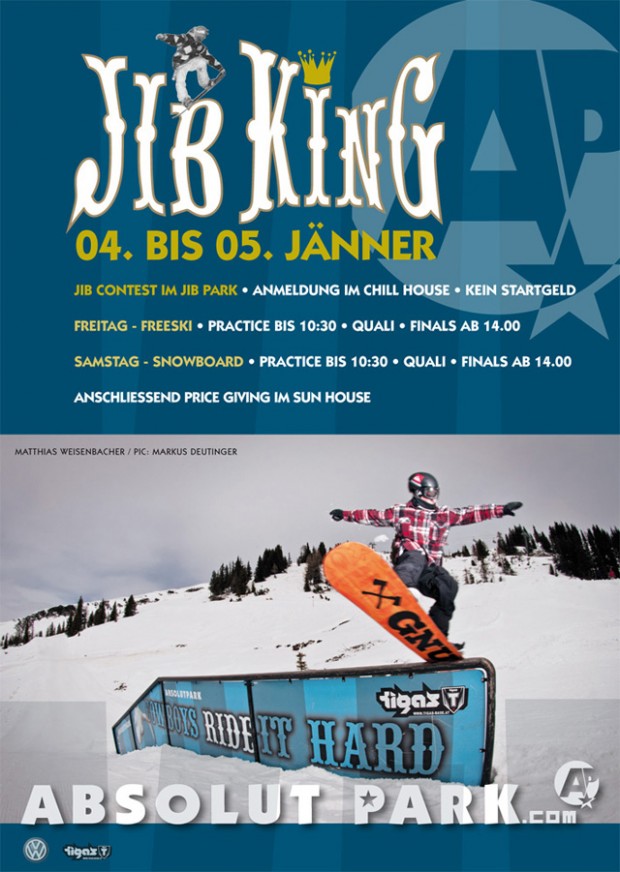 Pünktlich zu Beginn des neuen Jahres startet mit dem Jib King 2013 die Absolut Park Serie in Flachauwinkl. Am 04. und 05. Januar fällt der offizielle Startschuss für alle Jib begeisternden Rider, die in den Kategorien U15, Girls und Boys um wertvolle Sachpreise kämpfen. Erwartet werden rund 100 Freeskier und Snowboarder die versuchen ins Finale einzuziehen, um sich erstmals auf dem original Stairset des Air & Style München messen zu dürfen.