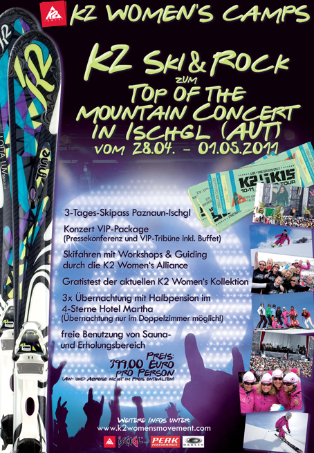 Das Konzept der beliebten Ski-Camps von K2 wurde für diese Saison ausgebaut – insgesamt zehn internationale Ski-Camps von Dezember 2010 bis Mai 2011, maßgeschneidert von Frauen für Frauen. Eines der absoluten Highlight-Camps ist das Camp K2 Ski & Rock! Mit dem neuen Motto und den Stars der Superlative geht es zur ultimativen Closing-Party in Ischgl. Alle Teilnehmerinnen werden beim K2 Women’s Camp Ski & Rock gemeinsam drei Tage Skifahren, Feiern und einen VIP-Konzertgenuß mit „The Killers“ in der einzigartigen Alpen-Lifestyle-Metropole erleben.