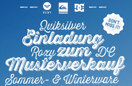 “Wir laden Euch herzlich zum Musterverkauf von Quiksilver, Roxy und DC Shoes ein. Neben der Musterkollektion für Herren von Quiksilver & DC (Größe M & L)...