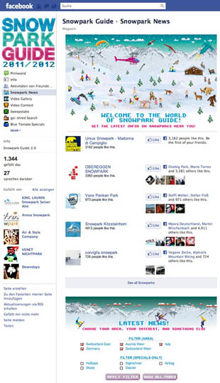 Die neue Snowpark Guide Facebook Seite reizt die Möglichkeiten der weltweit beliebtesten Web 2.0 Plattform aus: Dank einer neuen, personalisierbaren Newsfeed-Übersicht hat man die wichtigsten Infos zu den besten Parks in Zentraleuropa stets zur Hand.