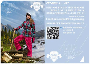 Wer bei dem virtuellen O’Neill Holzhack Battle bis zum 18. Dezember 2011 das meiste Holz gehackt hat und somit den Punktestand führt, ist freudiger Gewinner des VIP Wochenendes beim O’Neill Evolution im schweizerischen Davos und darf auch noch eine Begleitperson mitnehmen. Der spektakuläre Event findet vom 06.-08. Januar 2012 statt und erwartet schon jetzt internationale Größen des Freestyle Snowboardens, wie O’Neill Snowboarder Sebastien Toutant.