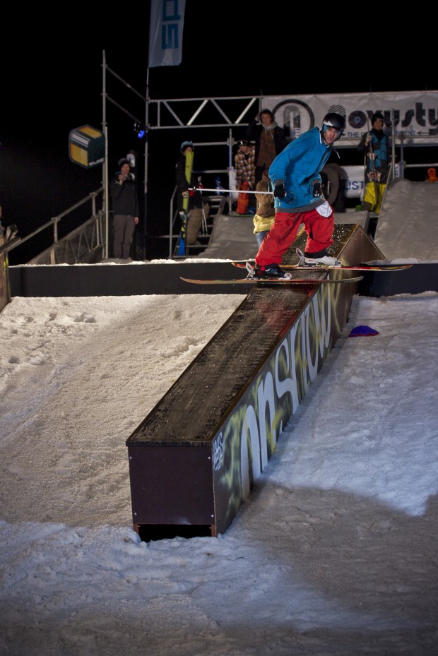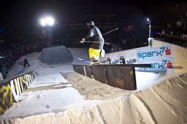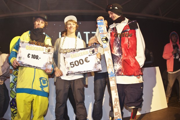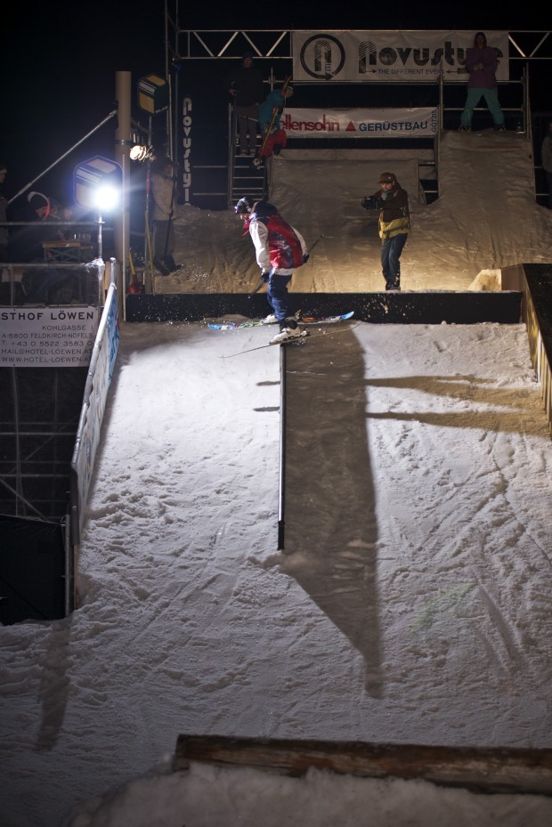 Nach einem ausgiebigen Training hatten sich bereits mehrere hundert Zuschauer eingefunden und um ca 20:00 begann die einstündige Qualifikation in Form einer Jamsession. Bereits hier zeigte sich, dass die Vorarlberger Szene durchaus einige gute Railfahrer vorweisen kann. 270ons aufs Downrail waren genau so häufig wie Switchups und Pretzels, bei den Snowboardern war sogar ein Flip-up in Form eines sehr sauberen Frontflips vom Flat aufs Down der Kinkbox zu sehen. Nachdem eine Stunde lang jeder alles gegeben hatte, standen die 4 Finalisten fest: Fabian Braitsch, Pius Schneier, Julius Schneider und Jürgen Nigg.