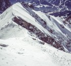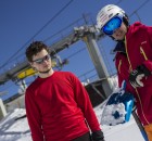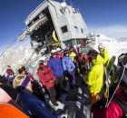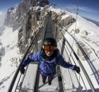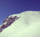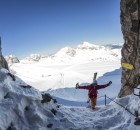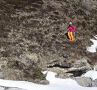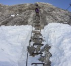 Der nächste Tag begann wieder um 8 Uhr. An diesem Tag stand eine längere Tour im Gelände auf dem Plan. Dafür bekamen wir einen Klettergurt und ein Klettersteigset. Denn der Hang, den wir fahren wollten, war nicht so einfach zu erreichen. Wir mussten die Snowboards und Ski auf den Rücken schnallen, eine etwa 30m hohe Leiter hochklettern und durch einen Tunnel auf die andere Seite des Felsens gehen. Dort befand sich der Einstieg in den Hang.