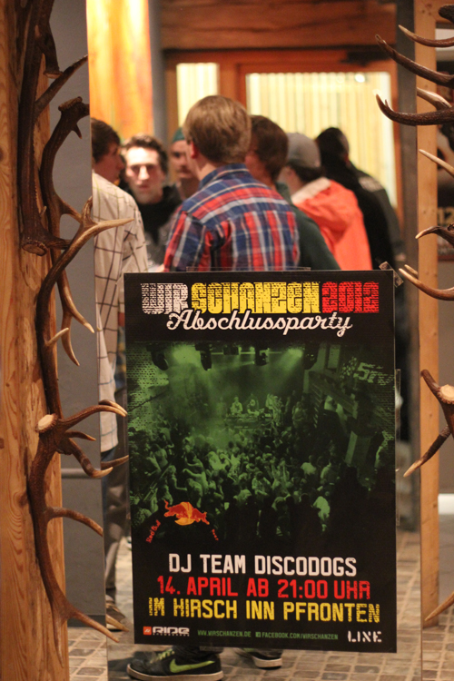 Am 14. April 2012 traf sich die Allgäuer Szene im Hirsch Inn in Pfronten zur Absch(l)ussparty, um die Gesamtsieger der Tour in den einzelnen Kategorien zu feiern. Schmackhafte Kaltgetränke, gemixt mit den Beats von den Discodogs aus Köln, ergaben den perfekten Abschluss der Wir Schanzen 2012.