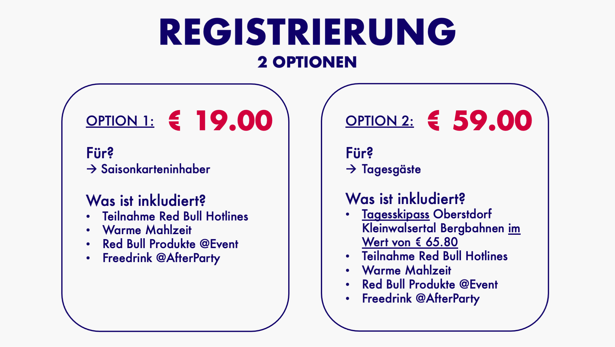 Die Eventanmeldegebühr deckt den Skipass für den Tag ab, kostet weniger als ein regulärer Tagespass am Fellhorn und beinhaltet zudem eine warme Mahlzeit sowie kostenlose Getränke beim Event und der legendären Afterparty. Inhaber einer Saisonkarte können für nur 20 € teilnehmen.
