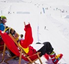 Zweites gratis Überraschungsei ist das kostenlose Pro Coaching im dauerpräparierten Terrain Park. Mit auf dem Dampfer sind Pius Schneider und Chris Fischer, die auch beim Lernvideo „K2 School of Rockers“ den Schulmeister gegeben haben. Und wer trotz Protipps für Rails und Kicker noch immer auf mangelndes Equipment („falsche Socken“) schiebt, holt sich am Teststand des Hauptsponsors das Material von kommender Saison.