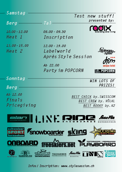 Die Style Session bietet ausserdem Angebote für Zuschauer, Freunde, Bekannte, Brüder, Schwestern und alle anderen. Im Test-Center können die neusten Modelle der kommenden Saison von Völkl, Elan, K2, Line und vielen mehr getestet werden. Gleichzeitig zum Crew- Battle und dem Test im Snowpark Morenia, startet bereits ab Mittag die Après-Style Session mit Musik, Barbetrieb und Labelworld unmittelbar neben dem Popcorn/Hotel Dom im Zentrum von Saas-Fee. Am Abend wird an der Afterparty im Popcorn und Livingroom mit der DJ Crew BEATZ4FREAKZ (DJ Li-o, DJ Yvori, DJ Lucky Face, DJ Doobie) kräftig weiter gestylt.