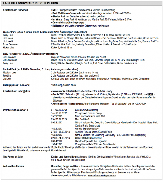 Rechtzeitig zur Eröffnung der weiteren Snowparks am Kitzsteinhorn steigen im Dezember auch gleich mehrere Events. Den Auftakt macht das Elooa Snowboardcamp vom 7. bis 9. Dezember 2012, bei dem man zusammen mit den Pro-Ridern Thomas Feurstein (AUT), Marco Smolla (GER) und Elias Elhardt (GER) seine individuellen Skills verbessern kann. Vom 14. bis 16. Dezember 2012 findet dann das Young Blood Freeski Camp statt. Beim bekanntesten und erfolgreichsten Freeski-Camp im deutschsprachigen Raum geben die besten Freeski-Pros aus Deutschland, Österreich und der Schweiz ihr Können an den Nachwuchs weiter. Am 15. Dezember 2012 fordert schließlich Nitro-Pro Marc Swoboda: Ride With Me! Bei dieser Session mit Marc Swoboda (AUT), Benny Urban (GER) und Dominik Wagner (AUT) verbessern die ersten 30 angemeldeten Rider beim Pro Coaching ihre Snowboard-Skills und testen nebenbei die neuesten Nitro-Snowboards. In der Test- & Chillarea erwarten zudem Liegestühle und feinster Sound mit DJ alle Parkfahrer.