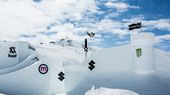 Das Haupt-Feature ist 60m weit und 11m hoch. Der größte Kicker darin misst stolze 35m, beinhaltet 5 Absprünge und 3 verschiedene Landungsoptionen. Die 11x11m Monster Mini-Ramp thront auf einem 16m hohen Schneewürfel und grenzt an eine 12m hohe und 30m lange Hip. Gleich daneben befindet sich der 12m lange GoPro Wallride. Auf der rechten Line steht das Blue Tomato Cannon Rail, dahinter folgt das O’Neill #unreasonable Feature, bei dem die Rider durch einen Tunnel speeden und entweder über die riesige Axt springen oder aber vor einer weiteren Hip landen können. Letzte Option in der Line ist das Völkl Stairset, ein weiteres Rail.