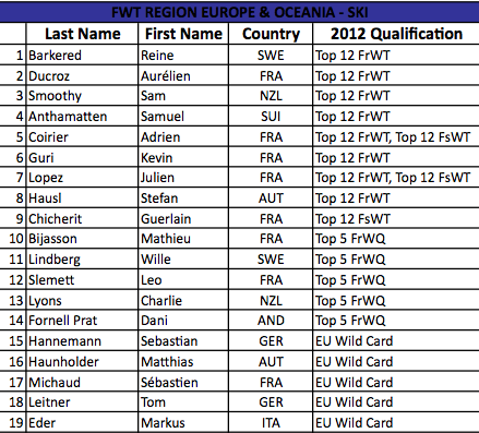 Eine große Saison steht bevor: Auf der neuen, vereinigten Tour treffen die weltbesten Bigmountain-Fahrer aufeinander Lausanne, Schweiz / Salt Lake City, USA ␣ 11. Oktober 2012 ␣ Mit vielen neuen Gesichtern sowie den stärksten Freeskiern und Snowboardern des letzten Winters geht die SWATCH FREERIDE WORLD TOUR BY THE NORTH FACE in ihre erste Saison als vereinigte Tour. Das Feld setzt sich dabei nicht nur aus den bestplatzierten Fahrern mitsamt fast aller Vorjahressieger der Swatch Freeride World Tour 2012, Freeskiing World Tour 2012 und The North Face Masters of Snowboarding 2012 zusammen, sondern wird durch eine Reihe starker Talente aus den Freeride World Qualifiers sowie hoch gehandelte Wildcards ergänzt. (Bitte lesen Sie die Kommentare der Athleten weiter unten)