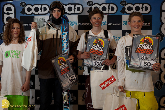 Die Jib-Session die aus zwei in einer Line stehenden Obstacles bestand, machte den Teilnehmern sichtlich Spaß. Sie bestand aus einer großen Industry Down-Tube und einem großen Riffelrohr. Das Starterfeld war gespickt mit Fahrern aus Österreich, Deutschland, Holland, Belgien, Schweiz und der Tschechei. Den Tagessieg bei den Kids U12 holte sich der Österreicher Elias Wechner. Seine Team-Kollegen vom „SC Arlberg Newschool Freeski Team“, David Wolf und Felix Aberstrolz landeten hinter ihm auf den Plätzen zwei und drei. Christof Egger, ein weiterer SCA-Team-Kollege wurde Vierter. Den Tourgesamtsieg und damit auch den „CaD Ring of Glory“, sowie ein Longboard von „ARBOR“, holte sich mit eindrucksvollen 100 Punkten überlegen der Österreicher David Wolf, vor Christof Egger (AUT) mit 67 Punkten und Michael Wechner (AUT) mit 64 Punkten.