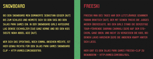 Die Sajas Park Games am 03. März 2012 waren auch in diesem Jahr ein voller Erfolg. Hochmotivierte Teilnehmer aus sechs Nationen, traumhaftes Wetter und ein perfektes Setup. Die Mischung aus Sonne, chilliger Atmosphäre und nicht zuletzt das top Niveau sorgten für einen rundum genialen Tag in der Silvretta Montafon.