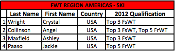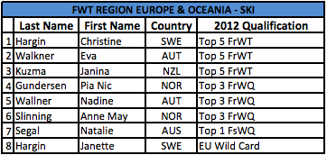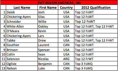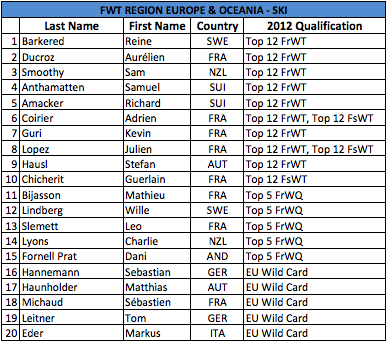 2013 werden bei der SWATCH FREERIDE WORLD TOUR BY THE NORTH FACE alle Sportler starten, die sich durch ihre Ergebnisse auf den drei Touren 2012 qualifiziert haben. Dazu kommen einige Qualifikanten aus den 4-Star-Qualifiern der letzten Saison sowie Wildcards von beiden Kontinenten.