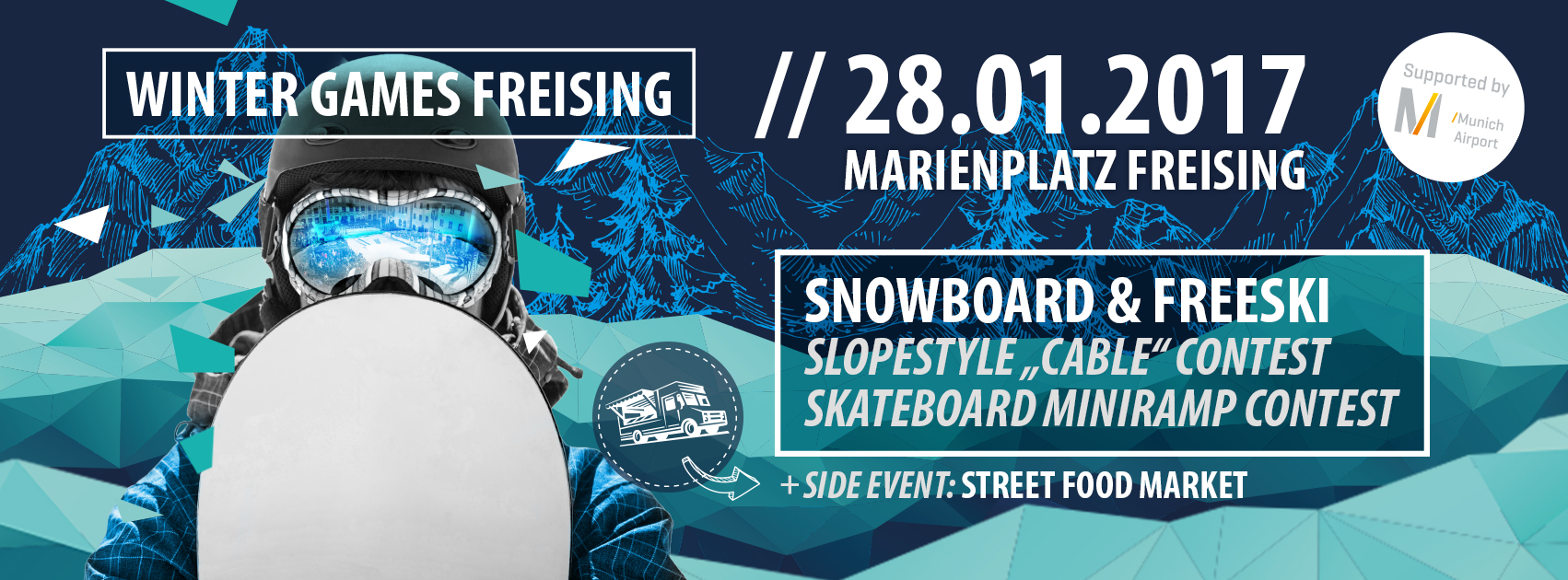 Nach zwei Jahren Abstinenz ist es endlich wieder soweit. Die Winter Games kommen am 28. Januar 2017 zurück nach Freising. Die Stadtjugendpflege Freising lädt in Zusammenarbeit mit dem Jugendamt und den Jugendzentren des Landkreis Freising zum zweiten Mal alle Snowboarder, Freeskier, Skateboarder, BMX und Streetfood-Liebhaber zu den Winter Games nach Freising ein. Die von München nördlich liegende Domstadt verwandelt sich dann in eine actionreiche Freestyle-Arena, in der sich die Besten der Besten batteln werden. Das Setup wird auf eine Art Wakeboardanlage ausgetragen, in der man mit einem Hebel durch das Setup gezogen wird. Am Anfang werden zwei Rail-Obstacles stehen, dann geht es auf eine Mini-Quarterpipe für eine Wende und zu guter Letzt per Slingshot und mit mehr Geschwindigkeit auf einen Kicker mit ca. 6m Table. Für die Contest-Teilnehmer gibt es Geldpreise in Höhe von 2.500.-€ zu gewinnen sowie Sachpreise im Wert von 5.000.-€. Des Weiteren ist auch für Side-Events am Freisinger Marienplatz gesorgt und wird keine Langweile aufkommen lassen.