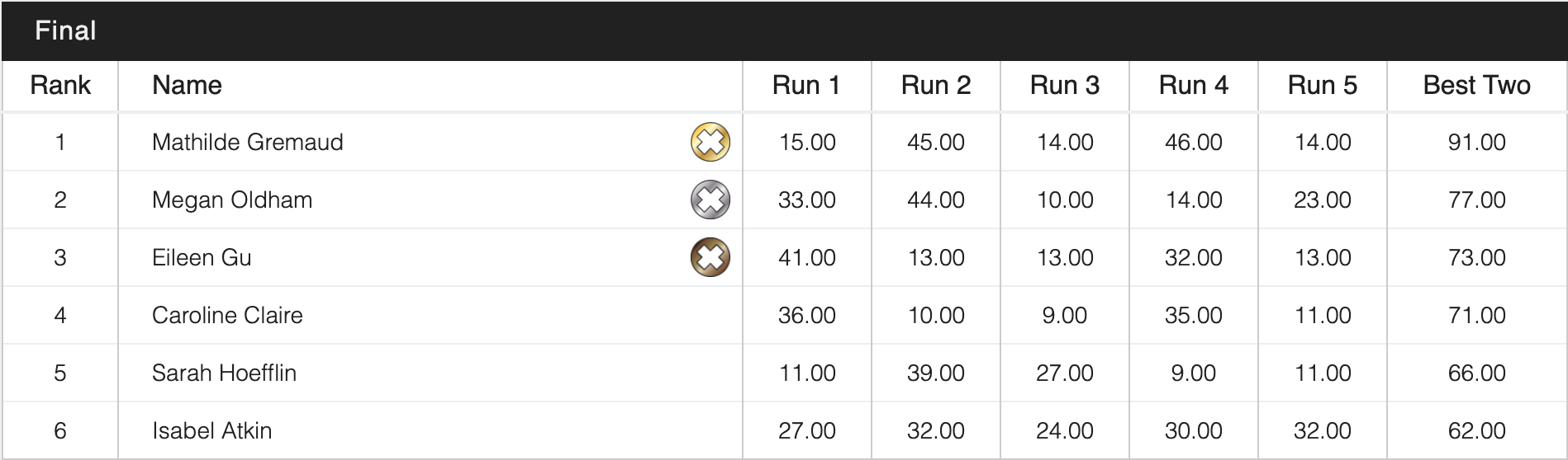Bei den Damen konnte Eileen Gu den Slopestyle Wettkampf für sich entscheiden. Die Chinesin kann insgesamt auf ein sehr gutes Wochenende zurückblicken, denn soviel vorweg: Die Slopestyle Goldmedaille war nicht die einzige, die sie abstauben konnte.