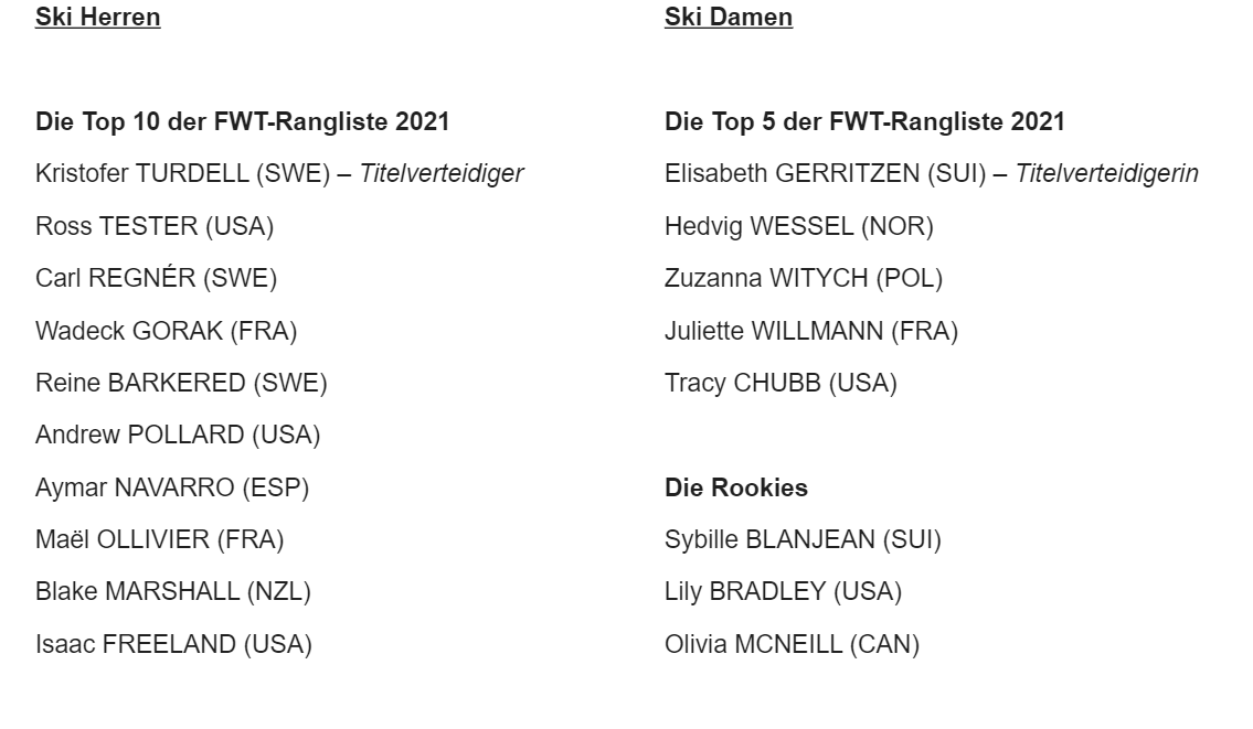 Neben den Performer*innen aus dem letzten Jahr ist auch mit den Rookies zu rechnen, die sich über die Freeride World Qualifier (FWQ) Events qualifiziert haben. Erfahrungsgemäß bringen die Youngguns jedes Jahr frischen Wind, neue Tricks und Styles in die Tour. Unter ihnen ist auch Valentin Rainer (AUT) aus Innsbruck dabei, der damit der einzige neue Teilnehmer aus dem deutschsprachigen Raum ist.