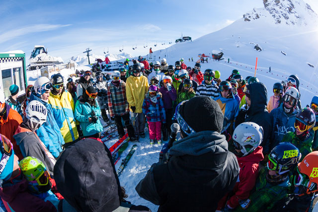 Schon in den frühen Morgenstunden stand eine Traube an Fahrern vor der Akkreditierung, um sich für den Contest anzumelden. Insgesamt gingen 88 Teilnehmer an den Start, um sich in den jeweiligen Kategorien zu batteln, denn schließlich ging es um wertvolle Sachpreise von RIDE Snowboards, Nike und dem Sajas Shop in Feldkirch, sowie 1.000 Euro Cash! Das sonnige Wetter hat natürlich auch zahlreiche Zuschauer in die Parkbase eingeladen, von welcher man den Contest gut überblicken konnte.