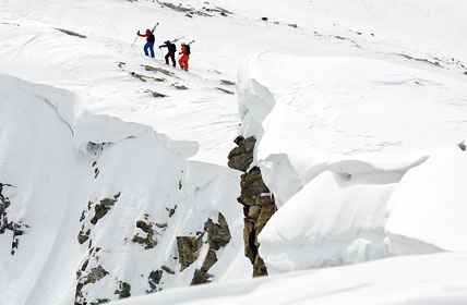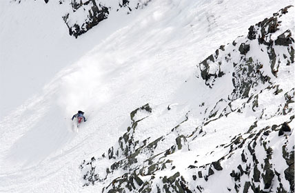 So, jetzt aber zu den Hardcore-Freaks. Wer vom Tuxer Fernerhaus in Richtung Bergstation des Gletscherbusses III blickt, dem sticht eine superedle Rinne ins Auge, die sich links vom Lift befindet und steil nach unten zieht. Dieser Run ist aber nur wirklichen Könnern zu empfehlen, denn der Einstieg über die exponierten Felsen ist ausnahmslos sehr trittsicheren Zeitgenossen zu empfehlen. Ein Sturz kann hier wirklich ganz übel ausgehen. Hinzu kommt, dass die Rinne nur selten befahrbar ist. Dies liegt zum einen an den Schneeverhältnissen, die für diesen Run auf Grund seiner Länge und Steilheit perfekt sein müssen. Zum anderen muss man sich vergewissern, ob die Engstelle in der Mitte der Rinne überhaupt befahrbar ist.
