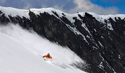 Wer die Augen offen hält, findet schnell das passende Terrain. Die ersten leichteren Runs warten auf euch im Bereich des Gletscherbusses II. Aus der Gondel lassen sich im kupierten Gelände zahlreiche Lines, kleinere Rinnen, Cliffs und unzählige Natural Hits abchecken. Da dieses Areal komplett unterhalb des Gletschers liegt, muss man sich bei seinen ersten Ausflügen schon mal keine Gedanken über Spalten machen und kann sich entspannt die ersten Turns des Tages reinziehen. Etwas problematischer in Bezug auf Spalten wird es eine Etage höher, nämlich unter dem Gletscherbus III. Wer schon einmal die Gelegenheit hatte, im Sommer den nackten Gletscher zu betrachten, der weiss, wovon ich rede: Die komplette Flanke ist von klaffenden Rissen durchzogen. Also vor dem Run auf jeden Fall den Local eures Vertrauens fragen, um wirklich kein Risiko einzugehen. Zu Beginn etwas steiler, zweigt die breite Rinne später rechts ab und zieht sich bei genügend Schnee immer flacher werdend bis hinunter zur Sommerbergalm. Und wenn es bis hier gut läuft, stehen die Chancen meistens nicht schlecht, dass man gleich bis ganz hinunter ins Tal fahren kann. In dem riesigen Kessel finden sich unzählige Lines, so dass man eigentlich immer ein unverspurtes Fleckchen findet, um sich auszutoben.