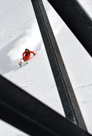 Dabei zählt der Gletscher im hinteren Zillertal zu einer aussterbenden Spezies, denn er gehört zu den wenigen Skigebieten, die 365 Tage im Jahr geöffnet haben. Zwar hat auch am Tiroler Dach die Klimaerwärmung ihre unübersehbaren Spuren hinterlassen, doch glücklicherweise ist der Eispanzer immer noch mächtig genug, um den Skibetrieb das ganze Jahr aufrechtzuerhalten. Wie viele andere Skigebiete wurde auch Hintertux in den 60er-Jahren mit Liften erschlossen. In den letzten zehn Jahren haben die Betreiber immer wieder investiert und die Lifte durch modernste Gondelbahnen erneuert. So garantieren die Gletscherbusse I bis III geringste Wartezeiten und transportieren die Wintersportler in Rekordzeiten auf den höchsten Punkt des Resorts, die Gefrorene Wand auf 3.250 Metern Höhe. Schneller geht es nur noch mit dem Heli. Anders als bei „normalen“ Resorts ist die Hauptsaison in Hintertux sicherlich der Herbst und das Frühjahr. Zu diesen Jahreszeiten findet man die besten Bedingungen, egal ob Freeride oder Freestyle. Im Oktober überschwemmt zusätzlich noch eine weitere Gattung den Berg. In ganzen Horden verzieren dann lustige Zeitgenossen in Rennanzügen die Hänge mit roten und blauen Fähnchen. Vom japanischen bis zum polnischen Nationalteam findet man beinahe jede Nation, die im alpinen Rennzirkus mitmischen will. Soll aber egal sein, denn uns interessieren ja hauptsächlich Backcountry und Park.