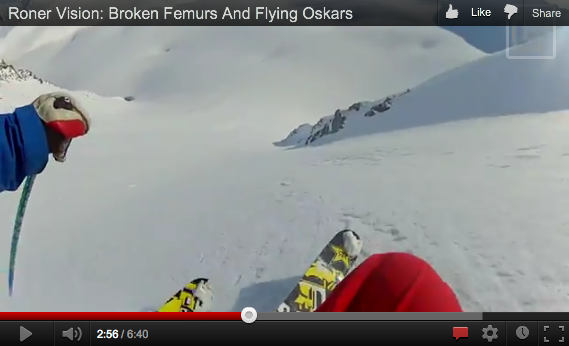 http://www.youtube.com/watch?v=poesxWJFh1I Und hier gleich die nächste Episode von Roner Vision. Jetzt ist Erik weiter nach Valdez gereist, um sich seinen Oberschenkel zu brechen. Darauf fliegt er...