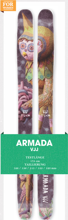 Der „VJJ“ ist erste Wahl der Armada- Ladys, wenn es frisch gedumpt hat: Die Ladys-Version des „JJ“ hat alle Vorteile des Herrenmodells. Fünf- teilige Taillierung, Freeride Rocker und ein kurzschwungverliebter Radius von zwölf Metern machen den Ski unglaublich vielfältig. Durch den straffen Flex im Tail gibt dir der „VJJ“ die Unterstützung, die du brauchst, um in größeren Hängen klarzukom- men. Der Ski hat trotz Rocker noch genug Kante, um ernsthaft freeri- den zu gehen. Dennoch ist der „VJJ“ das ultimative Fun Tool und wusste unseren weiblichen Testern ein fet- tes Grinsen ins Gesicht zu zaubern. Kein Cliff oder Pillow wurde links liegen gelassen und dank des leichten Gewichts fielen Powder-Jibbereien mit dem „VJJ“ leicht. Carve auf der Piste, surfe den Powder – mit dem „VJJ“ kein Problem!