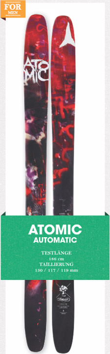 Wer sein Riding zwischen dem Big Mountain eines Todd Ligare und den verspielten Backcountry-Einlagen von Chris Benchetler sieht – also nur von der Vorliebe, versteht sich – der stand bisher vor einem Problem, denn einen Kompromiss zwischen „Atlas“ und „Bent Chetler“ suchte man vergeblich in der Atomic Range. Bisher, denn mit dem neu entwickel- ten „Automatic“ wurde diese letzte Lücke geschlossen. Dana Flahr und Sage Cattabriga-Alosa durften sich bei der Konstruktion dieser Waffe austoben und sie nach ihren Bedürf- nissen gestalten. Regular Camber, beinahe symmetrische Rocker an Tip und Tail, ein harter Flex von der Mitte bis zum Skiende und eine „mo- derate“ Powder-Taille von 117 Milli- metern charakterisieren den Ski. Ergebnis sind Laufruhe, Auftrieb und eine präzise Kontrolle. Well done!