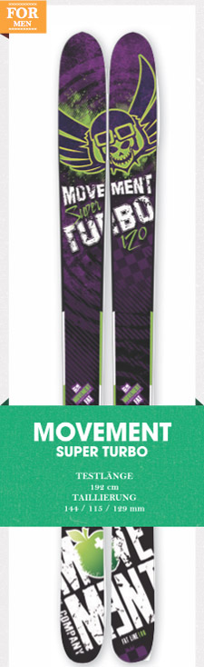 Den Movement „Super Turbo“ als reinrassigen Big-Mountain-Ski zu entlarven, der große und schnelle Turns mag, fiel unseren Testfahrern nicht schwer. Dies ist das Spezial- Metier des Schweizers. Dass er durch seine extreme Ausmaße und das höhere Gewicht wenig agil ist, wunderte niemanden. Dafür zieht er (Straight) Lines wie auf Schienen und steckt auch massive Cliff Drops locker weg. Bei kleineren Schwün- gen fühlt sich Movements Freeride- Planke eher unwohl und und forderte den Fahrern einiges an Einsatz ab. Auf chilliges Cruisen durch die Wälder oder andere Backcountry- Spielereien kann man mit dem „Super Turbo“ gepflegt verzichten. Dafür ist er auch nicht gedacht, die großen Hänge sind sein Terrain. Die Tester waren sich einig: 100 Prozent Freeride und 0 Prozent Freestyle!