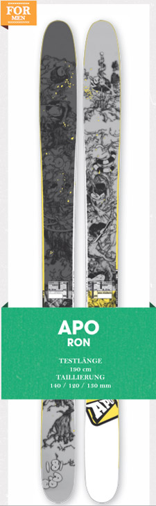 Nachdem Apo im letzten Winter Sammy C. ins Team locken konnten, dachten wir uns, dass die Latten der Frenchies doch was taugen müssten. Also entschlossen wir uns, den Apo „Ron“ zu testen. Bei Betrachtung der Ski fielen als Erstes die flashige Base und das sicke Design auf. Design ist zwar Geschmack- sache, aber hier wurden die Style- Hausaufgaben gemacht. Als fetteste Planke der französischen Brand ist der „Ron“ natürlich auch erste Wahl für Sammy C. an Deep Days. Der US- Pro und BC-Styler vor dem Herrn weiß schließlich, was im Pow gut geht. Durch das Rocker Design sowie 120 Millimeter Taille mit 1,90 Me- tern Länge schwamm der „Ron“ super auf und surfte chillig durch den Pow. Zum Heizen ist er allerdings etwas zu weich, was seine BC Kicker Performance aber wettmachte. Pow!