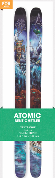 Ui, bei dem Design hat sich Mr. Benchetler aber ordentlich vermalt. Zu- mindest lösten die neuen Graphics des Atomic-Kultskis eher verhaltene Reaktionen bei den Testfahrern aus. Aber Aussehen ist ja zum Glück nicht alles und der „Benti“ kann sich getrost auf seine inneren Werte verlassen. Wie immer kam das Pro Model von Chris Benchetler ganz nach dessen Vorlieben daher. Im Powder zeigte er sich direkt spielerisch und verleitete die Rider zu der einen oder anderen BC-Freestyle-Einlage. In der Luft fühlt sich der Ski richtig gut am Fuß an – sehr leicht und easy zu spinnen. Landen gefällt ihm vor- wie rückwärts gleich gut. Sowieso ist der „Bent Chetler“ im BC-Freestyle- Bereich einzuordnen. Speed mag er trotz des härteren Tails nicht so sehr. Auf der Piste ist er nach wie vor gewöhnungsbedürftig!