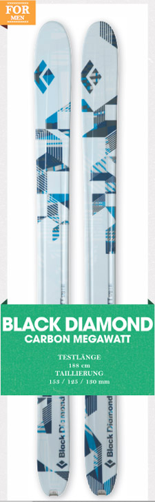 Wie vermutet handelt es sich beim „Carbon Megawatt“ um eine extrem leichte Version des Freeride-Klassikers aus dem Hause Black Diamond. Diese schwimmt im Powder genauso schnell auf wie der schwerere, aber vom Shape baugleiche Bruder. Doch im Gegensatz zu der solideren Pow- der-Version fängt die tourentaugli- che bei höherer Geschwindigkeit schneller das Flattern an. Okay, irgendwo muss man bei Gewichtsreduzierung seine Abstriche machen. Sonst unterschieden sich die beiden Modelle aber nicht sonderlich von- einander. Klar, dass bei einer Taille von 125 Millimetern die Eignung auf Hardpack nicht gerade Begeisterung hervorruft. Wer sich diesen Ski zulegt, will ohnehin die Zivilisa- tion hinter sich lassen und selbst im tiefsten Powder noch einen tourentauglichen Ski sein Eigen nennen.