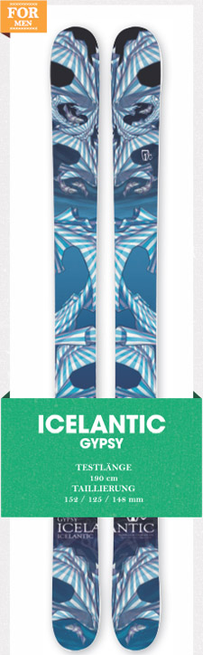 Der „Gypsy“ ist ein 125 Millimeter breites Powder-Spaßgerät. Durch den Full Rocker und dem annähernd symmetrischen Twintip-Shape sind hier die Segel eindeutig auf BC-Jib- bing gesetzt. Entspanntes Powder Cruising mit Butter-Intermezzos, Pillows oder eben die klassische Backcountry Kicker Session – das sind die Disziplinen, die der Icelantic „Gypsy“ locker beherrscht. Dank des weichen Flex ist er hier auch fehler- tolerant. Spielerisch setzt du Turns in den Champagne Powder, ohne dass der „Gypsy“ die Laufruhe verlieren würde. Sobald du jedoch auf harten Untergrund, sprich, die Piste kommst, ist der Spaß vorbei. Hier ließ sich der „Gypsy“ nur schwerlich auf die Kante bringen und auch im zerfahrenen Schnee vermissten die Testfahrer etwas die Kontrolle. Ansonsten ein funny BC-Tool!