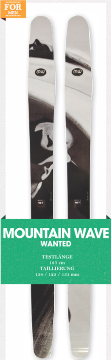 Etwas unscheinbar im Design kam der „Wanted“ von Mountain Wave daher. Ob der „dickliche Graue“ mit seinen mächtigen Rockern davon ablenken wollte? Falls ja, ist es ihm gelungen, denn unsere Tester griffen fleißig zu und testeten den „Wanted“ in jedem Terrain. Und mag man ihnen Glauben schenken, funktioniert der Ski überall echt gut. Der „Wanted“ ist ein Ski für vielseitige Skitage. Im Powder vermittelte er Surf Feeling wie kaum ein zwei- ter Ski beim Test, ohne jedoch auf der Piste zu versagen. Durch das Twintip-Design konnte er die Tester auch beim BC-Kickern überzeugen. Für ernsthaftes Big Mountain ist der „Wanted“ allerdings zu weich und durch die extremen Rocker ist die Kante zu kurz. Wieder ein Ski, der eher die BC-Freestyler überzeugen konnte als die Traditionalisten.