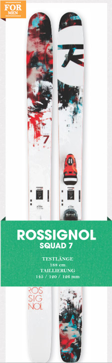 Was war das damals für eine radikale Big-Mountain-Waffe! Die Rede ist von Manu Gaidets Pro Model, dem „Bandit B-Squad“. Die Franzosen haben sich anscheinend an dieses kompromisslose Teil erinnert, als sie eine freeride-taugliche Version des „S7“ kreieren wollten. Ergebnis dieser interessanten Reagenzglas- Paarung ist der „Squad 7“. Mehr Steifigkeit, weniger Sidecut und ein flacheres Tail haben dem „S7“ die nervösen Mätzchen ausgetrieben, für die der Twintip gerade bei schnellerer Gangart bekannt war. Jetzt liegt der Ski satt auf der Kante, schwimmt aber dank 122-Millimeter-Taille und gut abgestimmtem Tip Rocker im Powder immer noch schnell auf. In Verbindung mit einer horizontal ver- schiebbaren Bindung lässt sich so- gar noch mehr an Vielseitigkeit aus dem „Squad 7“ kitzeln. Geiles Teil!