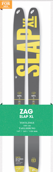 Auch den großen Bruder vom „Slap“, den „Slap XL“, empfanden unsere Tester als gewöhnungsbedürftig und die Meinungen gingen auseinander. Die einen empfanden den Ski er- staunlich agil, andere hingegen als erwartet träge. Vor allem auf hartem Untergrund und im verspurten Schnee heimste der „Slap XL“ ne- gative Comments ein. Aber das sind schließlich nicht die Spezialgebiete des Franzosen. „These skis are dedicated to your big powder sessions“, meinen die Frenchies und das stimmt in gewisser Weise auch. Hier funktioniert der Ski am besten und wurde sogar hin und wieder mit dem Prädikat „empfehlenswert“ gekennzeichnet. In jedem Fall ist der Ski denjenigen zu empfehlen, die schon einige Erfahrung im Backcountry sammeln konnten. Anfängern wird der „Slap XL“ kaum Fehler verzeihen.