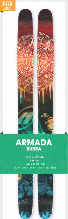 Armada erweitert mit dem „Bubba“ ihre sowieso schon vielseitige Palette an Powder-Modellen. Ein Blick genügt, um zu wissen, dass er in den Deep Pow gehört. Dieser Eindruck bestätigte sich bei Kontakt mit dem geliebten Weiß. Im Tiefschnee floatet der „Bubba“ wie Sau und zieht spielerisch seine Turns. Durch den moderaten Flex nimmt er Freestyle-Einlagen dankend an. Gerade bei Butters und Powder 180’s wusste der „Bubba“ zu überzeugen. Auf Hardpack oder der Piste fährt sich der „Bubba“ sehr eigen. Erst hier bemerkten die Tester, dass sie doch recht viel Ski am Fuß hatten. Sie bemängelten, dass der Ski bei Speed das Flattern anfängt und sich die Schaufel gerne mal einfrisst. Hat man sich aber an den 3D Sidecut gewöhnt, lässt sich der „Bubba“ doch ziemlich entspannt carven.