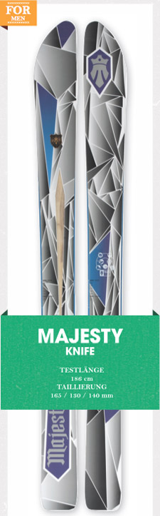 Der „Knife“ vom polnischen Core- Label Majesty war eines der kompromisslosesten Modelle im dies- jährigen Skitest. Mit adipösen Ausmaßen von 130 Millimeter Mittelbreite und einer 165er-Schaufel war die Marschrichtung vorgegeben: ab in den Tiefschnee! Um das komplette Potenzial des „polnischen Powder-Messers“ voll ausschöpfen zu können, fehlte davon leider ein halber Meter. Trotzdem holten die Test-Rider alles aus dem „Knife“, was ging. Bei mittlerem Tempo ließ sich die Planke ohne Probleme durch den Powder manövrieren und war trotz enormer Breite relativ spielerisch zu handlen. Wurde es aber steiler und schneller, wurde der Ski etwas instabil. Auch auf Hardpack und der Piste fühlt sich das Flaggschiff nicht sonderlich wohl – aber das sieht man dem Ski auch an!