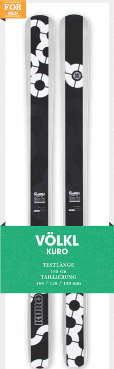 Völkls Freeride-Kampflatte war eines der kontrovers diskutierten Modelle des Tests. Mit 132 Millimetern ist der „Kuro“ der Platzhirsch im Line-up und zog die Tester an wie eine alte Banane die Fruchtfliegen. Eins ist klar: Der „Kuro“ braucht kein Hindernis zu scheuen! Er bügelt einfach alles platt, was sich ihm in den Weg stellt, das bestätigten alle Rider. Kommen wir zu den Gegensätzen. Natürlich ist ein solch fetter Ski schwer im Vergleich zu anderen Modellen. Doch macht ihn das träge? Ein Teil der Tester bejahte diese Frage, der andere Teil fand den „Kuro“ für sein Ausmaße äußerst agil. Diese Agilität konnte er aber nur unter Speed zeigen. Auf welchem Untergrund, war ihm dann jedoch ziemlich egal. Ob du mit dem „Kuro“ fährst oder der „Kuro“ mit dir, liegt letztendlich an dir und deinen Beinen.